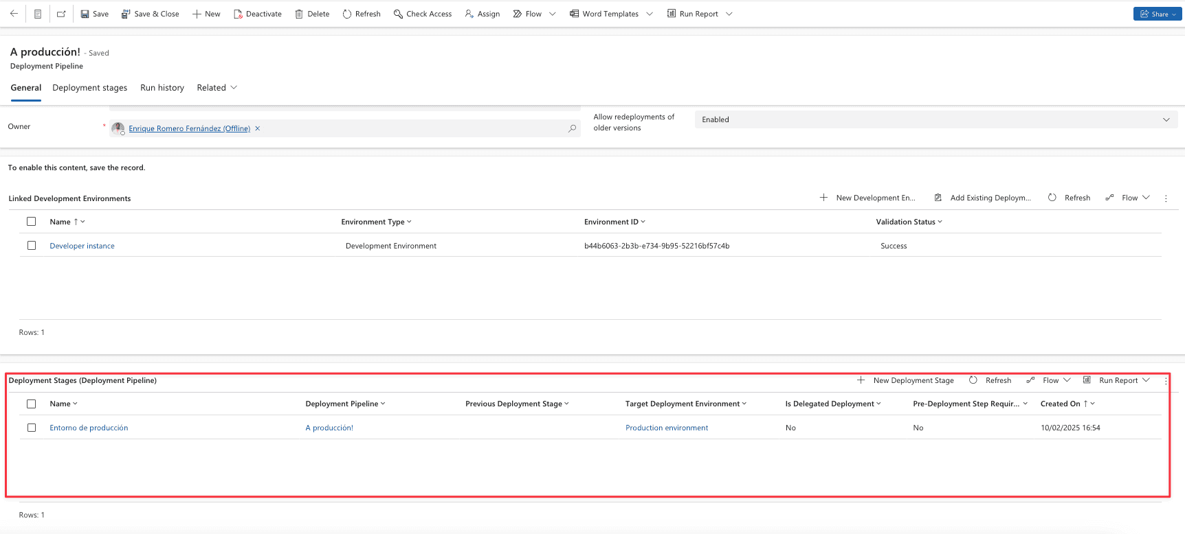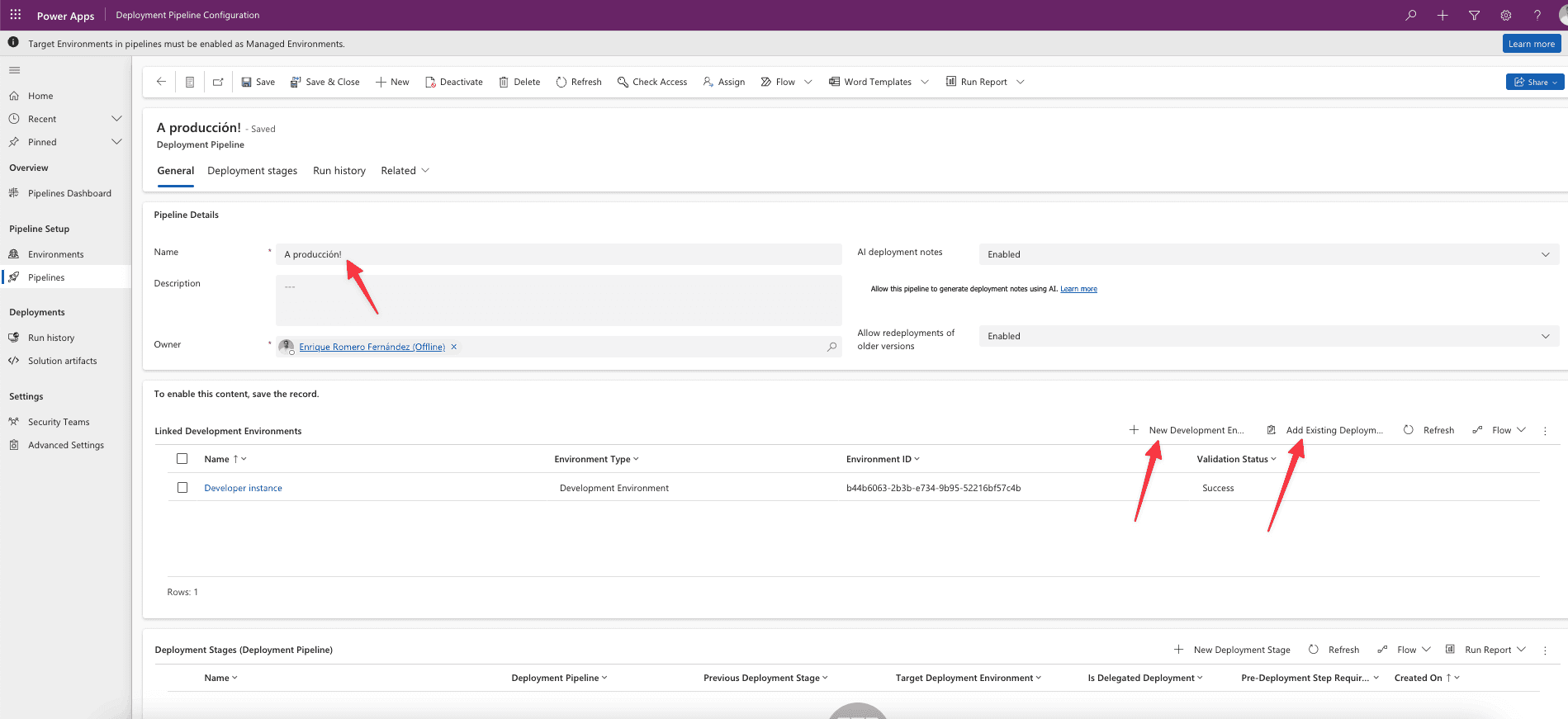 En la Pipeline debemos poner un nombre, guardar y dar de alta o añadir el entorno de desarrollo:
