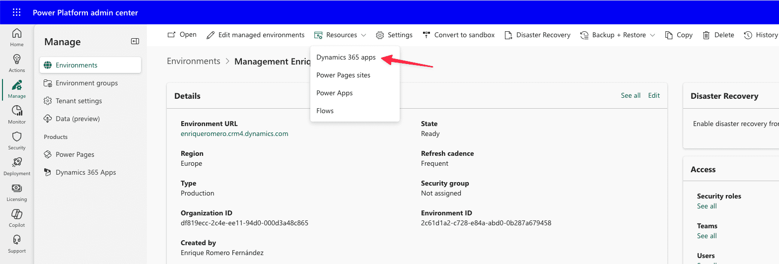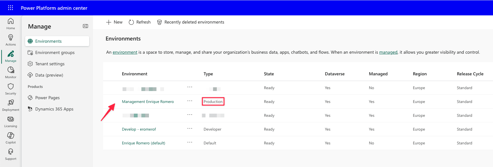 Lo primero que debes hacer es instalar Power Platform Pipelines desde el Centro de Administración de Power Platform. Aquí vamos a acceder a nuestro entorno de producción: