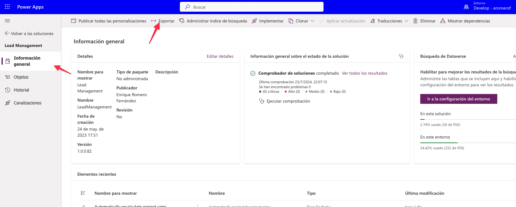 Básicamente ir a nuestra solución Power Platform con todos mis componentes y hacer click sobre el botón exportar: