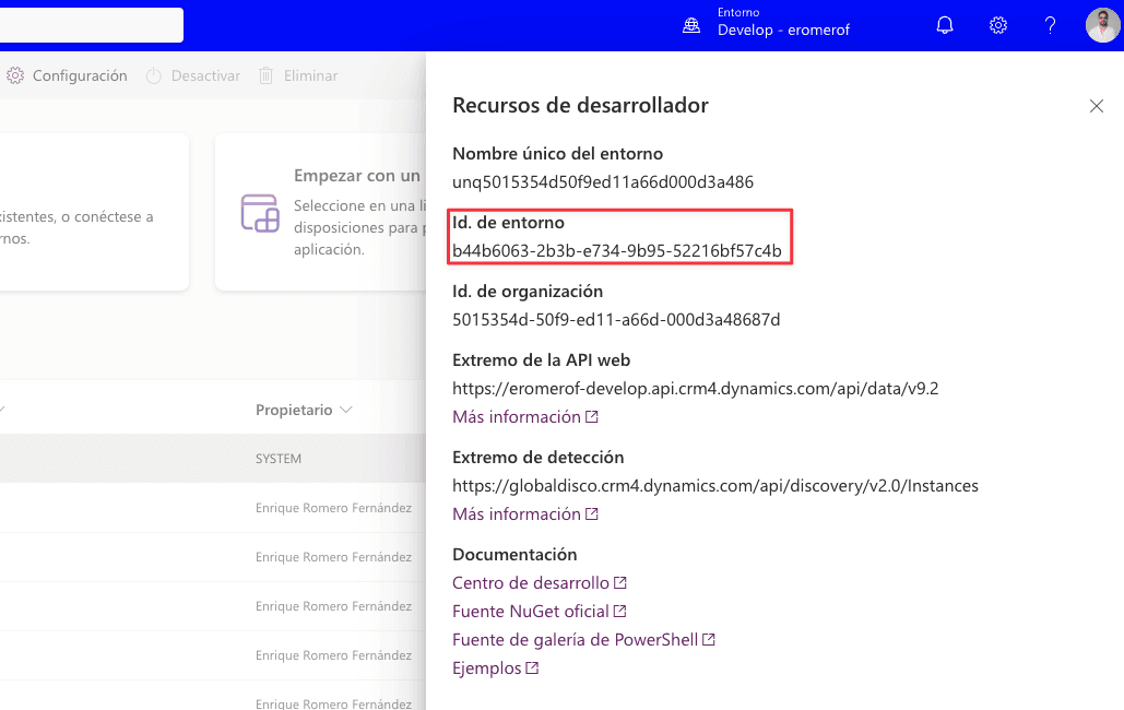 Cuando damos de alta un entorno dentro de esta aplicación nos solicitará un id del entorno. Ese id lo encontraremos en el portal de creación de Power Apps justo arriba a la izquierda en "Recursos del desarrollador":