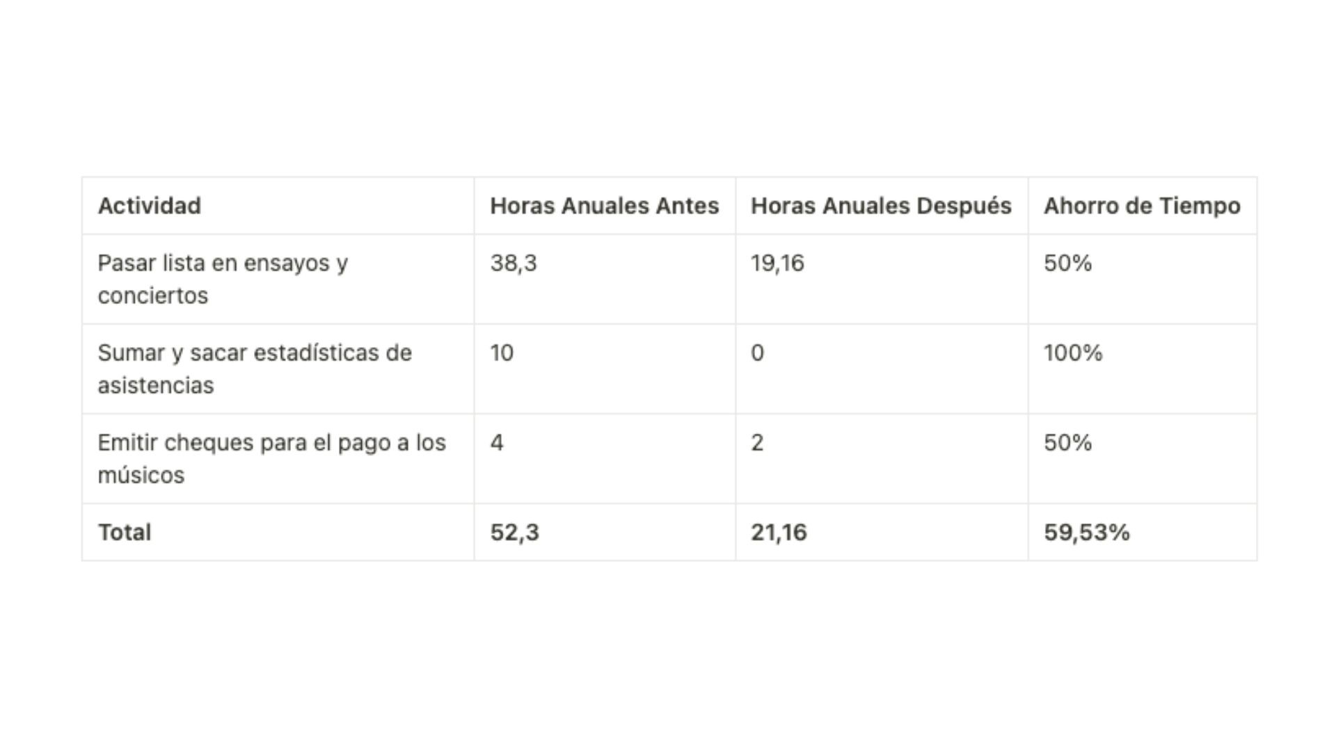 Control de asistencia manual: Dos miembros de la Junta Directiva pasaban lista en ensayos y conciertos utilizando hojas de Excel impresas, lo que consumía mucho tiempo y era propenso a errores.