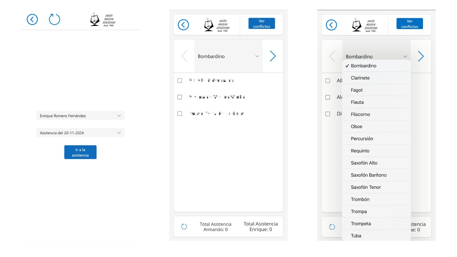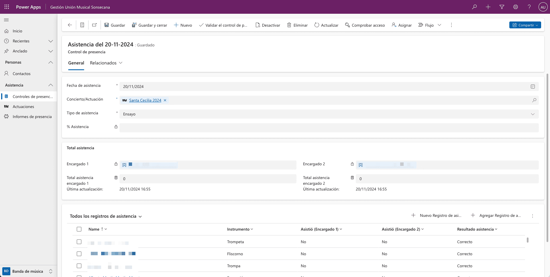 App de lienzo para el control de asistencia: Esta aplicación permite a dos miembros de la Junta Directiva pasar lista en ensayos y conciertos. La aplicación valida que la lista se ha pasado correctamente cuando ambos miembros han marcado las mismas personas. Algunas capturas de esta aplicación: